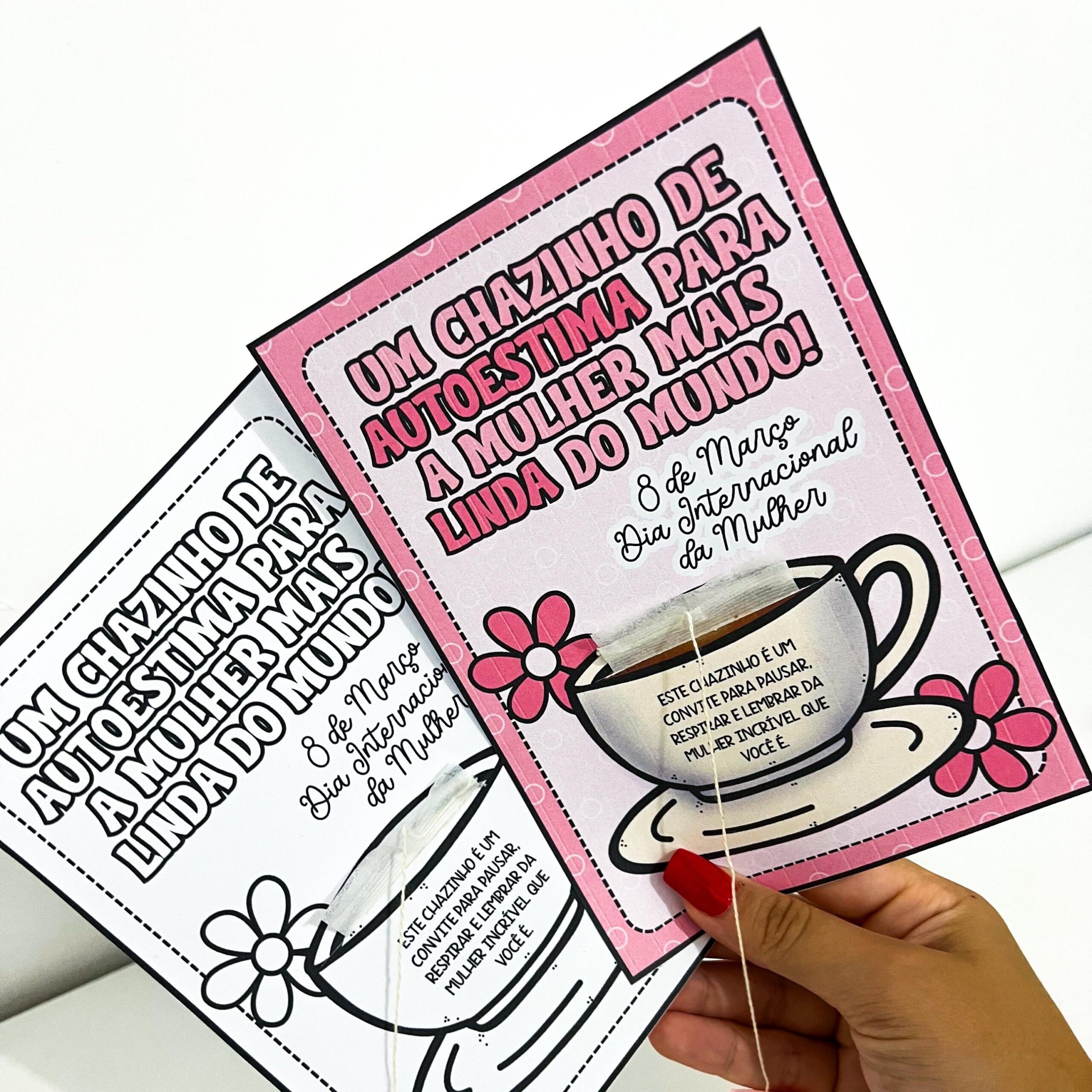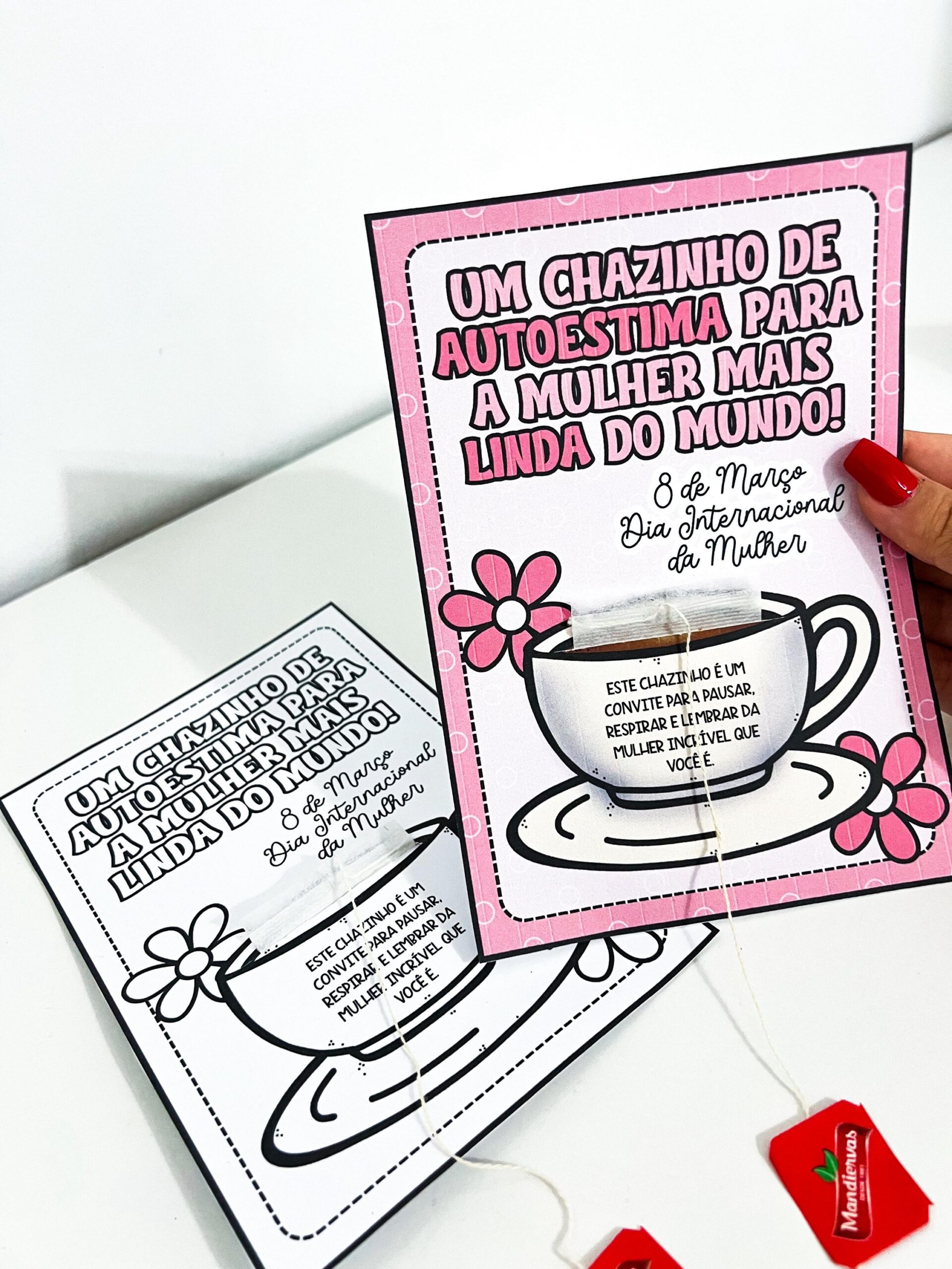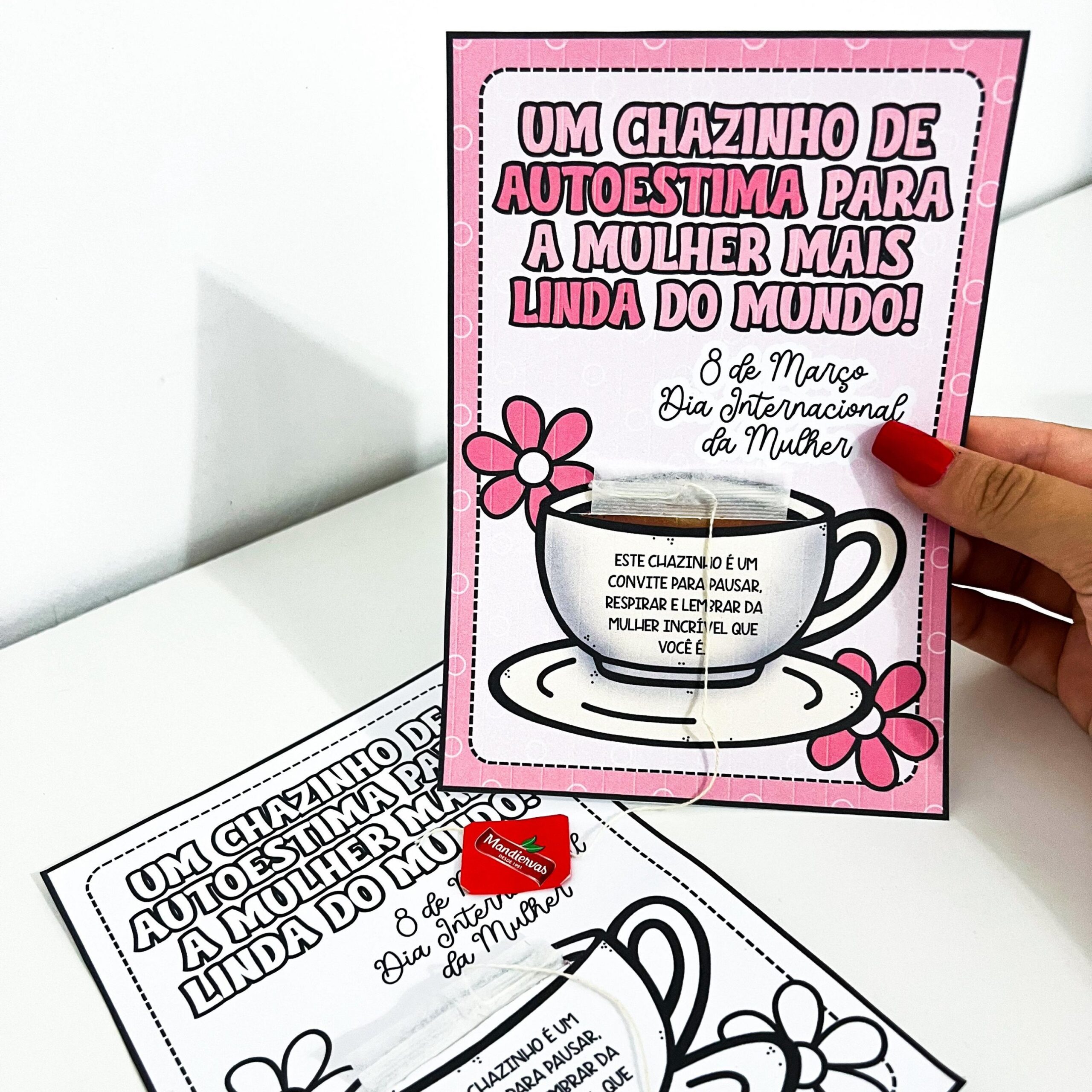 O cartão acompanha uma mensagem especial e espaço para fixar o sachê de chá ☕, transformando o mimo em um verdadeiro “Chazinho de Autoestima” — perfeito para aquecer o coração e fortalecer a autoestima.